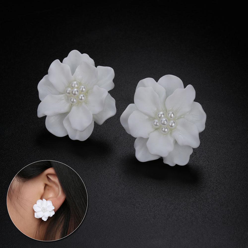 Fashion Women Girl Inlay Beads Simulated Pearl Stud Earrings Big White Flower Camellia