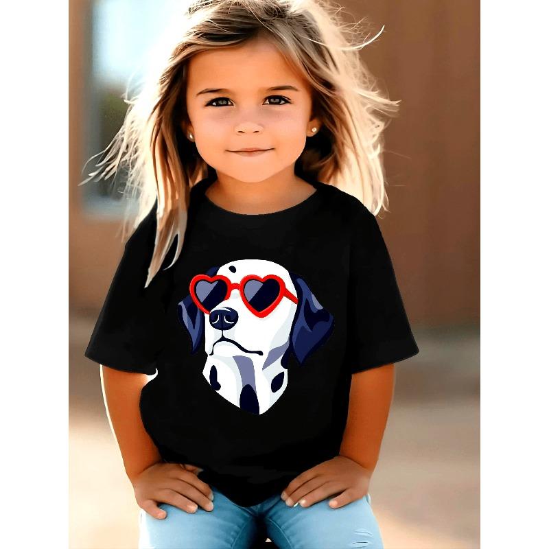 European Size Girls Summer Round Neck Short Sleeved T Shirt with Cartoon Version of A Great Dane Pattern