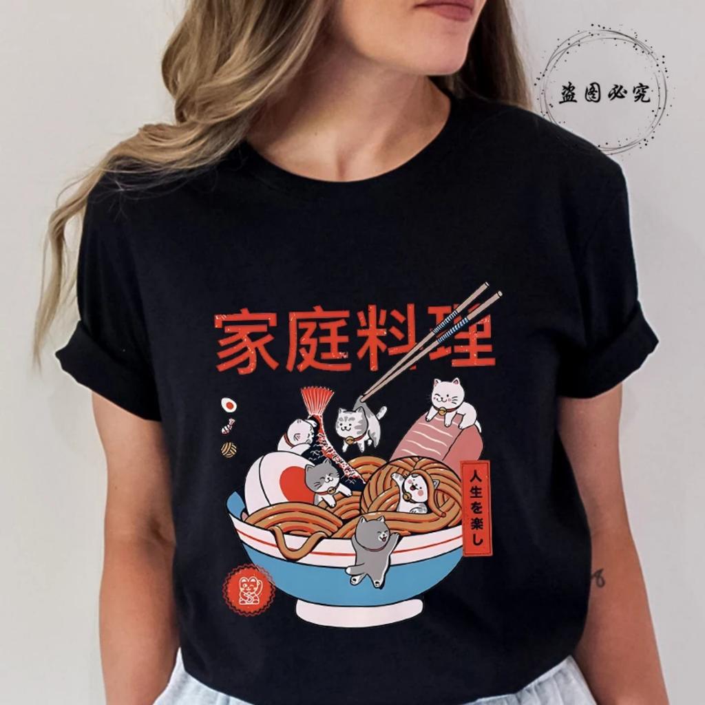 Kawaii Ramen Cats Food Tee Shirt Funny Women Harajuku Aesthetic Tshirt Vintage Female Streetwear Clothes Anime Cartoon Y2k Tops