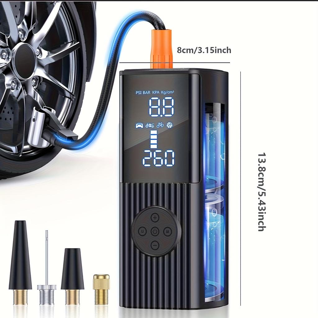 Portable Tire Inflator with Digital Pressure Gauge | 180 PSI, Rechargeable Battery, LED Light, Cordless, Suitable for Cars, Motorcycles, Bicycles