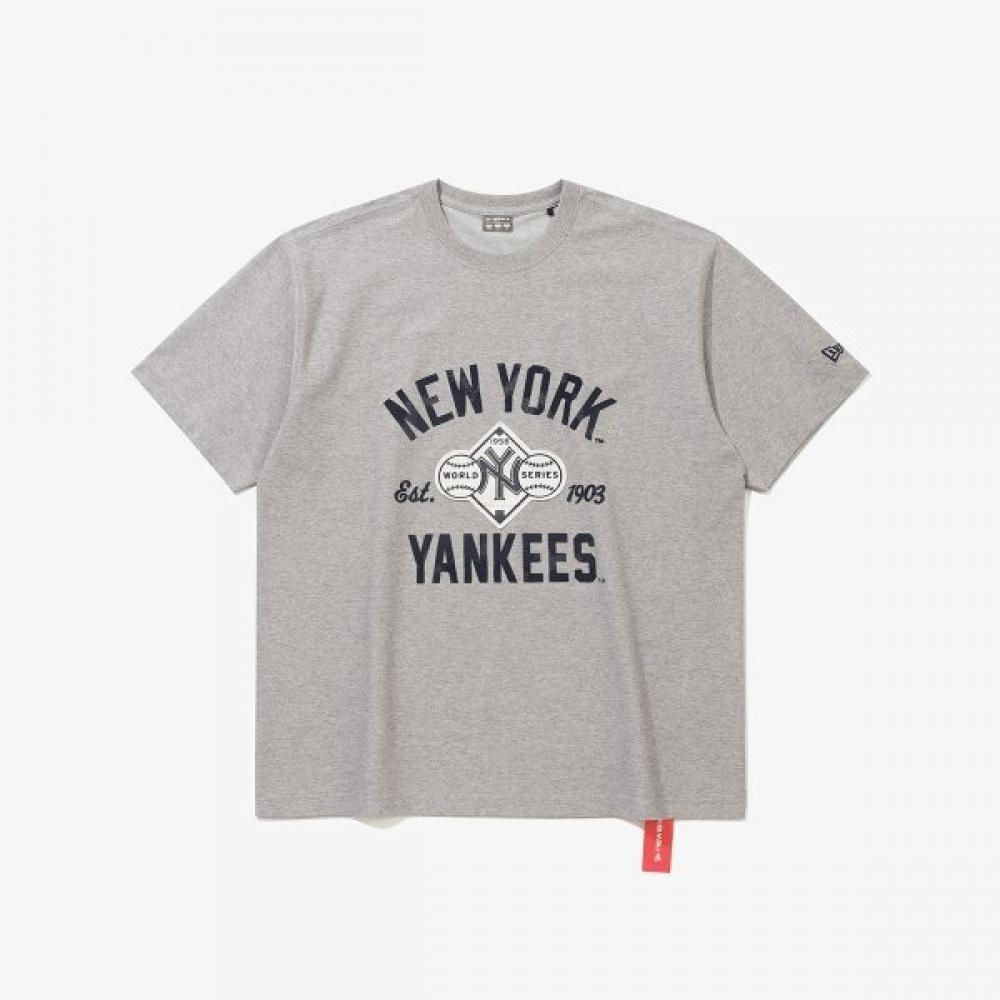 The New Era MLB New York Yankees 1958 T-Shirt Heather Gray commemorates the glory of the 1958 World Series champions. It features a design that invokes a classic mood, showcasing impactful graphics on a basic silhouette, allowing fans to express their passion. The color is Heather Gray, and sizes available are S, M, L, XL, and XXL.