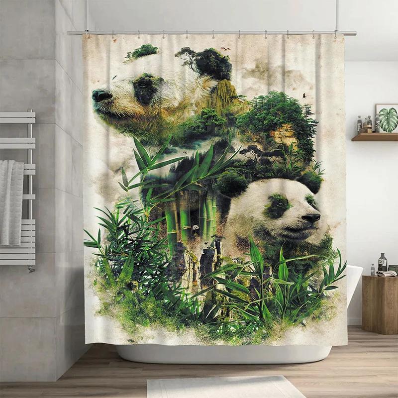Green Bamboo Forest Shower Curtain with Animal Design for Bathroom Decoration White Background Art Print Shower Panels
