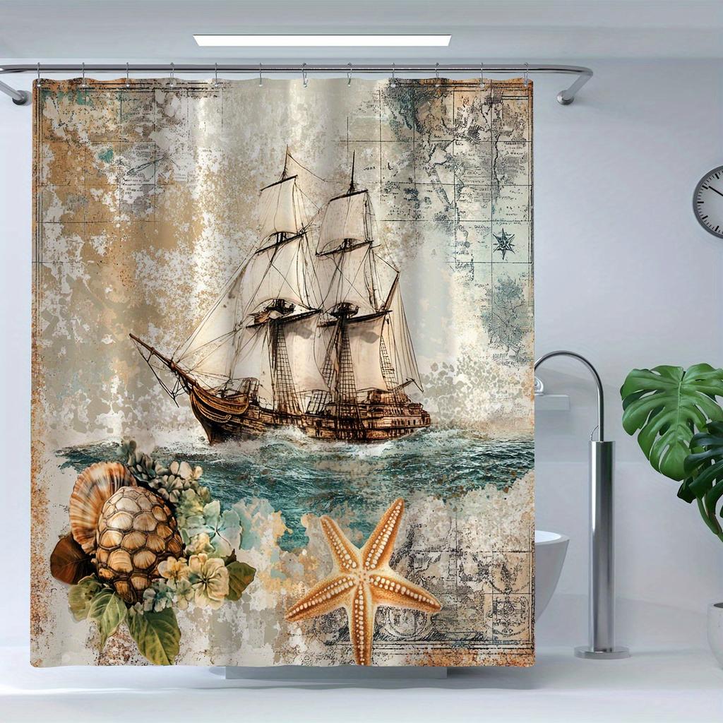 1 x Vintage Nautical Sailboat Era Digital Print Shower Curtain, Polyester with Hook, Machine Washable, Woven Texture