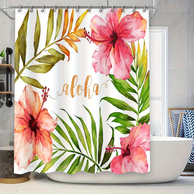 Hawaiian Shower Curtain Tropical Flowers Hibiscus Palm Leaves Beach Themed Decor Waterproof Bathroom Curtains Ocean Vibes Coasta
