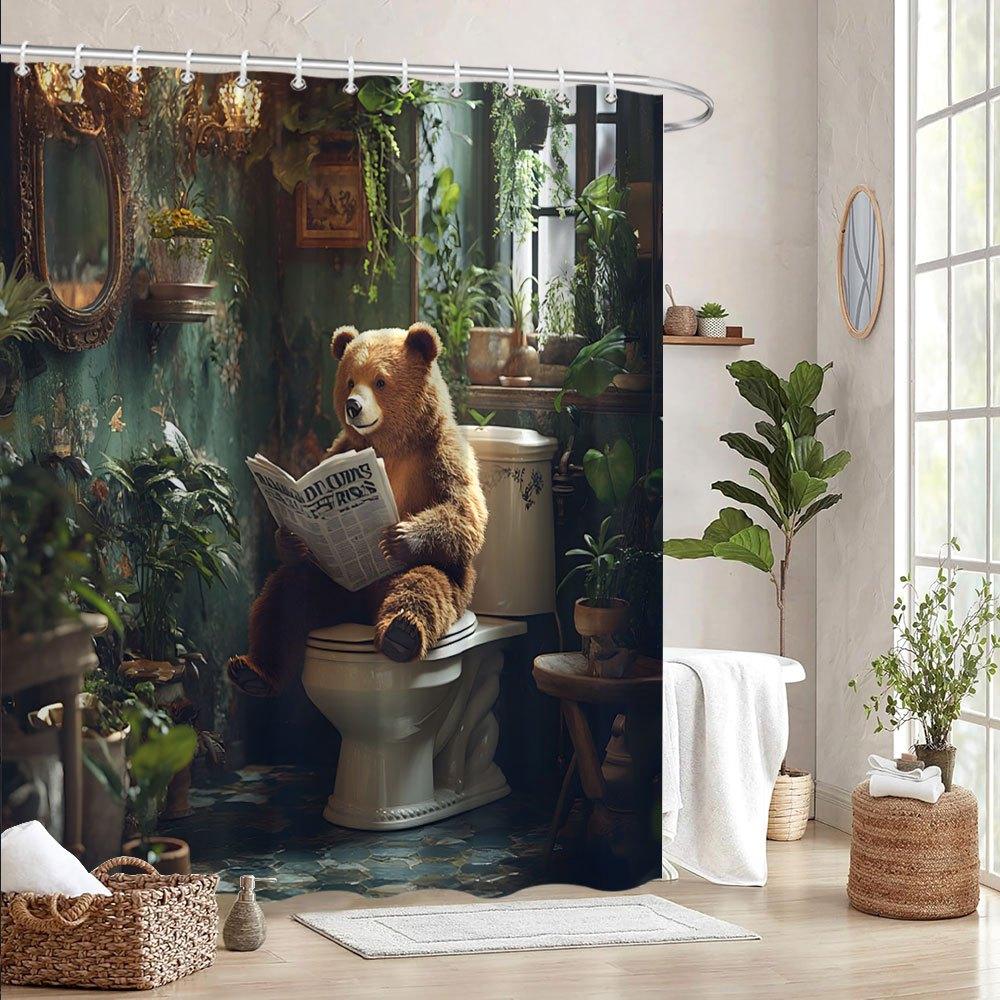 Whimsical Bear Reading Newspaper Shower Curtain Floral Plant Design Polyester Washable with 12 Hooks Eclectic Bathroom Decor