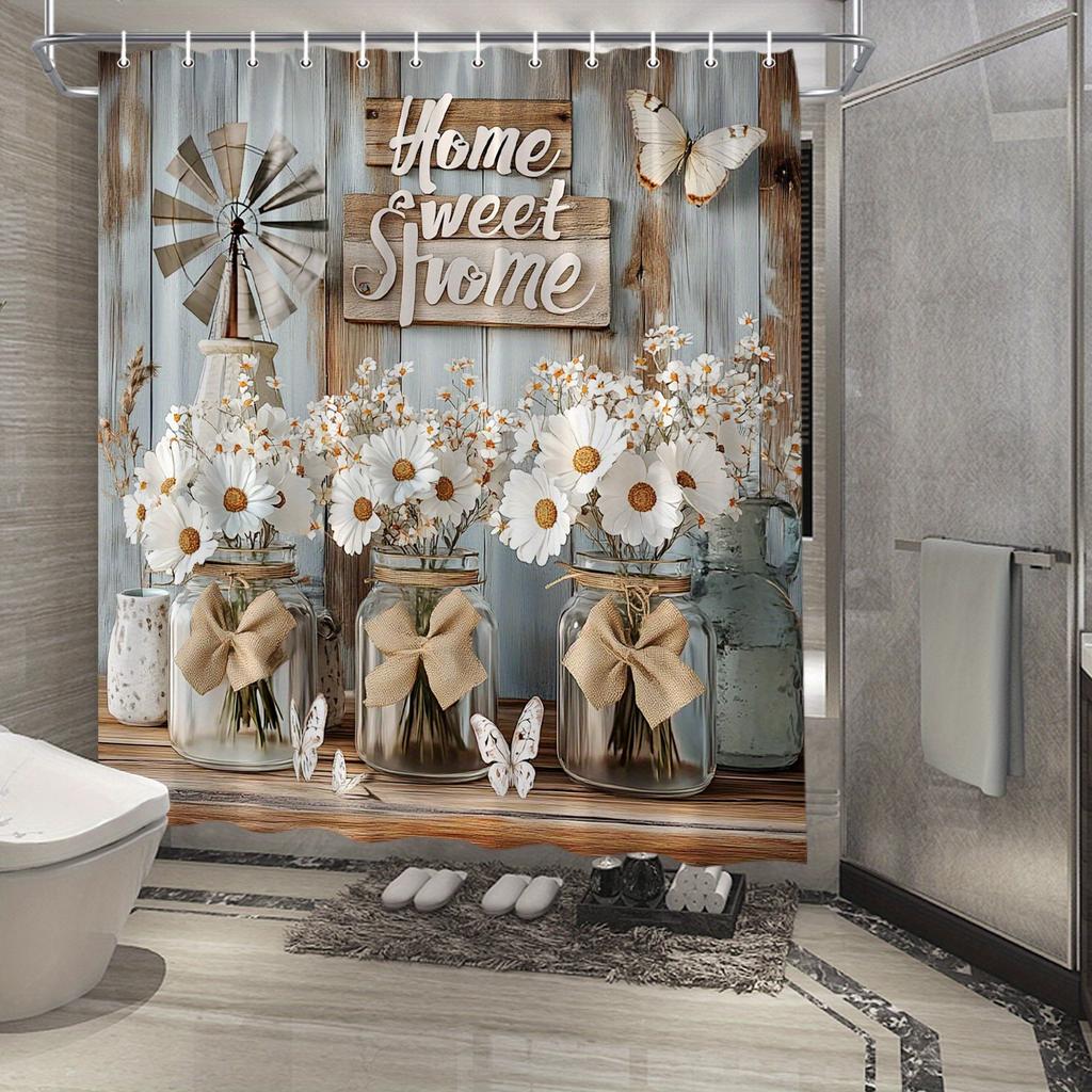 Rustic Floral Shower Curtain - Butterflies & Mason Jars with "Home Sweet Home" Design, Polyester Bathroom Decor