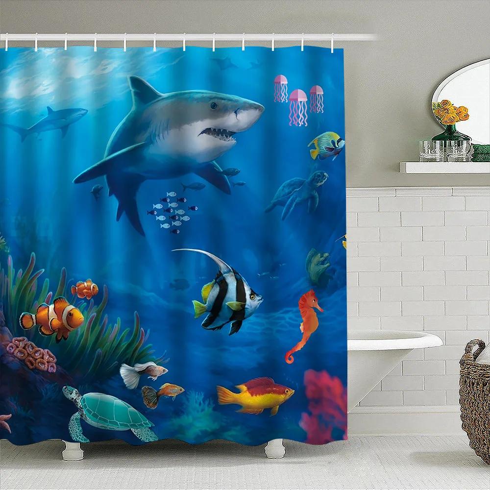 1pc Shark Ocean Shower Curtain Bathroom Partition Decorative Curtain Machine Washable Ocean World Print Window Privacy Curtain