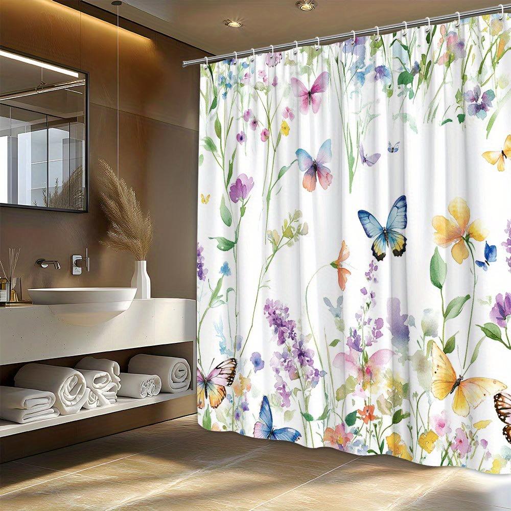 1pc Floral & Butterfly Watercolor Shower Curtain, Soft Polyester, Machine Washable, Fashion Theme, All-Season, Vibrant Design