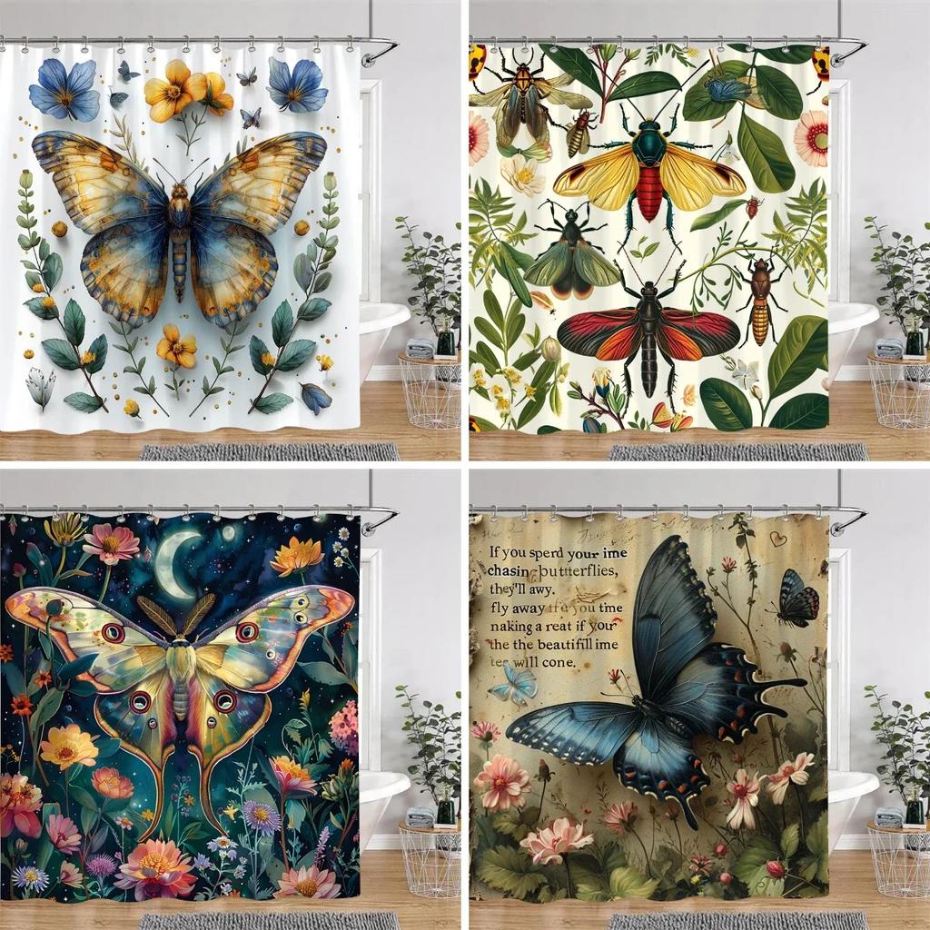 Bohemian Vintage Butterfly Shower Curtain Botanical Floral Astrological Insects Polyester Fabric Shower Curtains Bathroom Decor