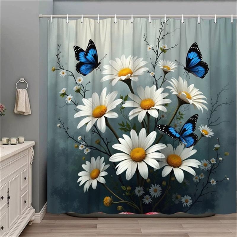 1pc Floral & Butterfly Shower Curtain - Polyester, Fashion Theme, 12 Hooks, Washable, 70.8x70.8", Easy Installation