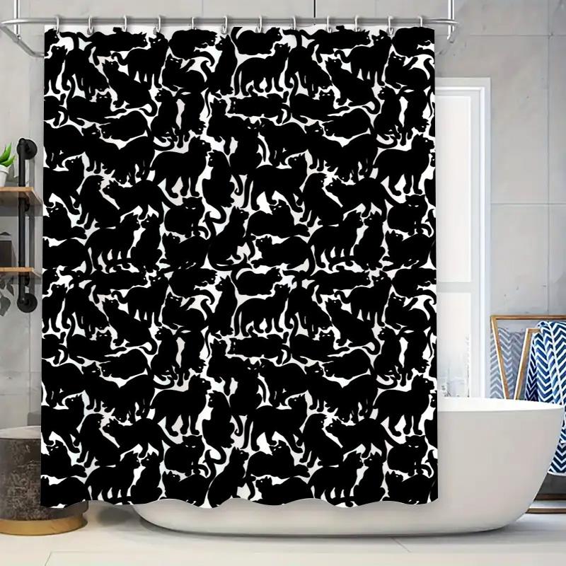 Black White Silhouette Cat Shower Curtain Set for Bathroom Decor Modern Home Accents