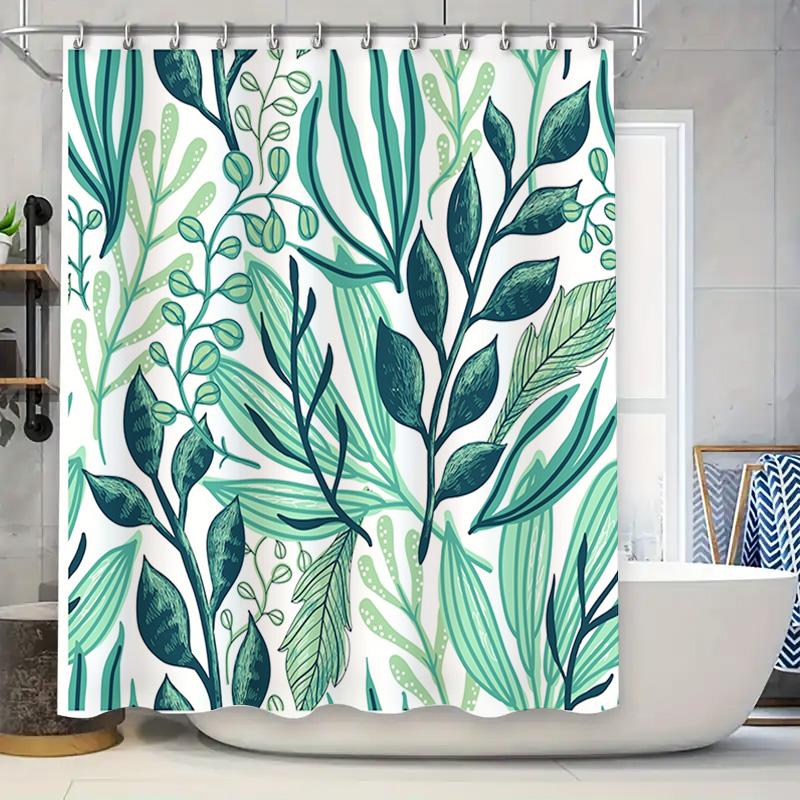 Green Leaves Shower Curtain Modern Floral Design for Bathroom Decor Waterproof Fabric with Hooks Included Set Length