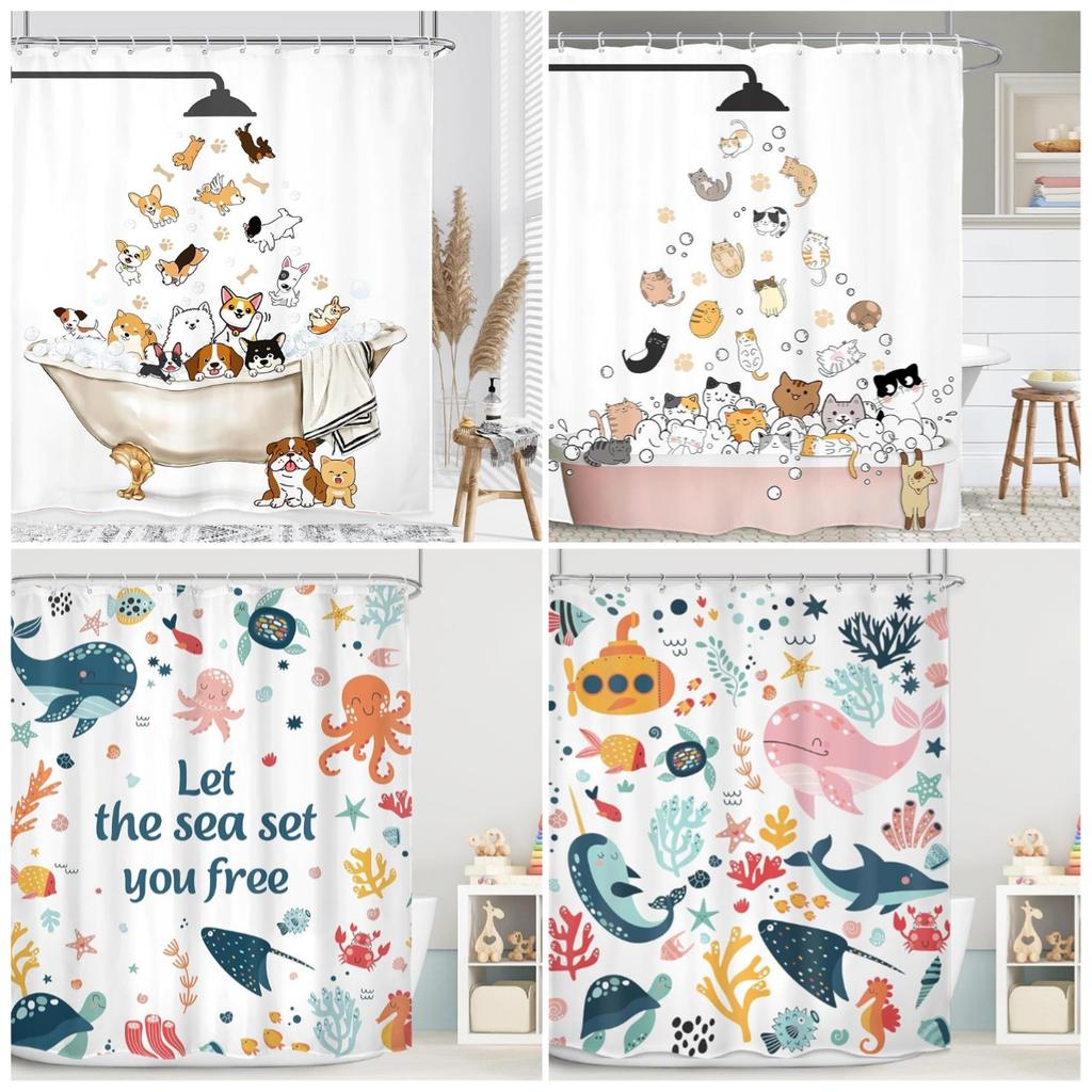 Funny Bathing Cat Dog Cartoon Shower Curtains Dolphin Octopus Sea Turtle Starfish Ocean Animals Bath Curtain Kids Bathroom Decor