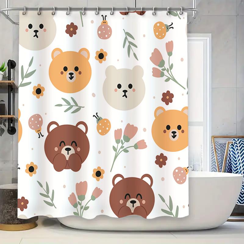 Adorable Cartoon Bear Print Shower Curtain for Bathroom Decoration White Floral Design Shower Panels Set with Hook Rings (180x27