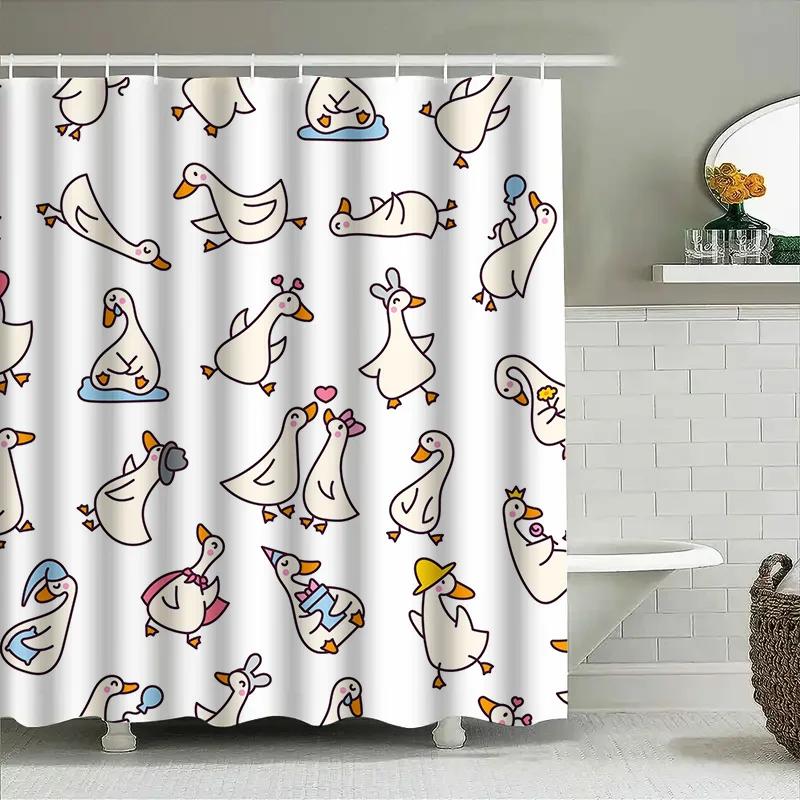 Vibrant Duck Family Cartoon Shower Curtain for Bathroom Decor White and Multicolored Design with Hook Rings Set included.