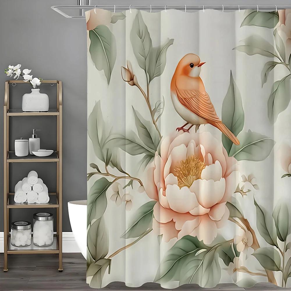 Różowa Kwiatowa Piwonia Ptak Zasłona Prysznicowa, Dekoracyjna Zasłona Prysznicowa do Łazienki, Wodoodporna Zasłona Prysznicowa z Haczykami
