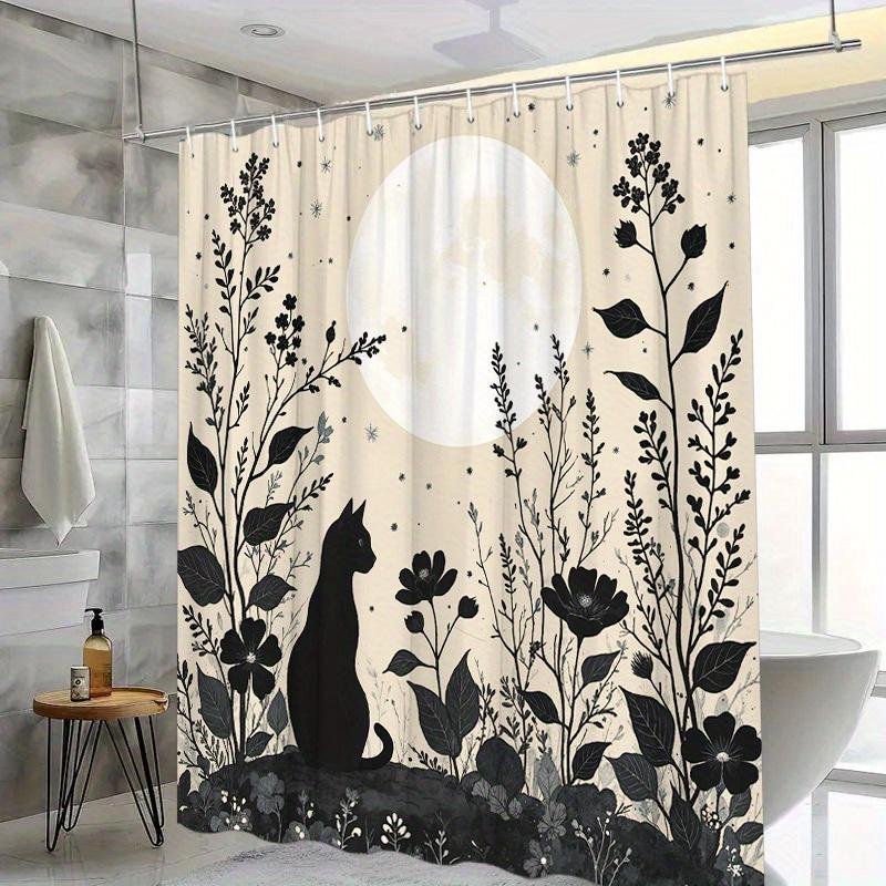 "1pc Black Cat Silhouette Shower Curtain - Floral Full Moon Design, Modern Bath Decor, Home Decoration