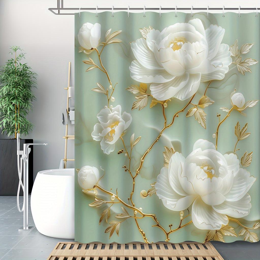 Elegant Peony Shower Curtain - Golden Leaf Design, Waterproof Polyester, Machine Washable, Floral Bath Decor