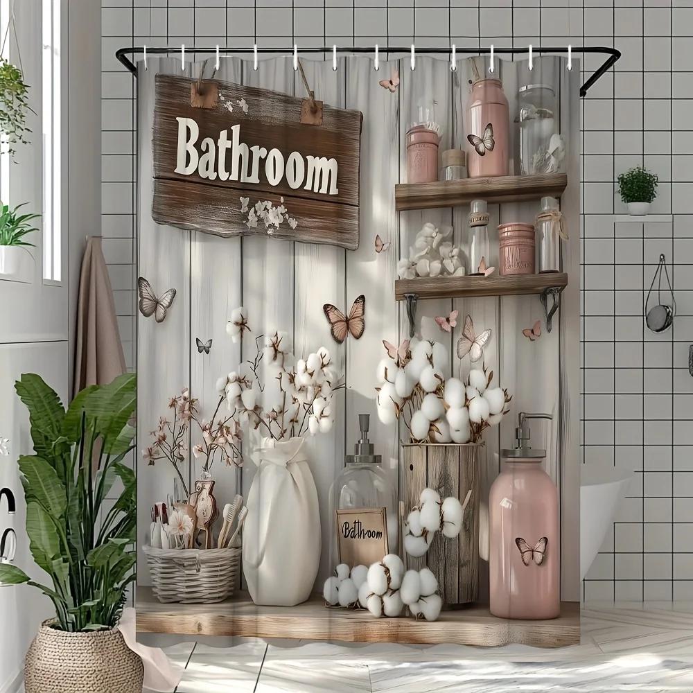 Floral Shower Curtain with Rustic Wooden Panels - Butterfly & Farmhouse Vintage Design, Includes Hooks, for All Bathrooms & Rods