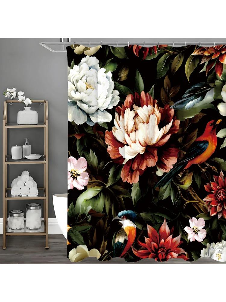 Peony Flower Green Leaf Bird Shower Curtain, Bathroom Decorative Shower Curtain, Waterproof Shower Curtain with Hooks