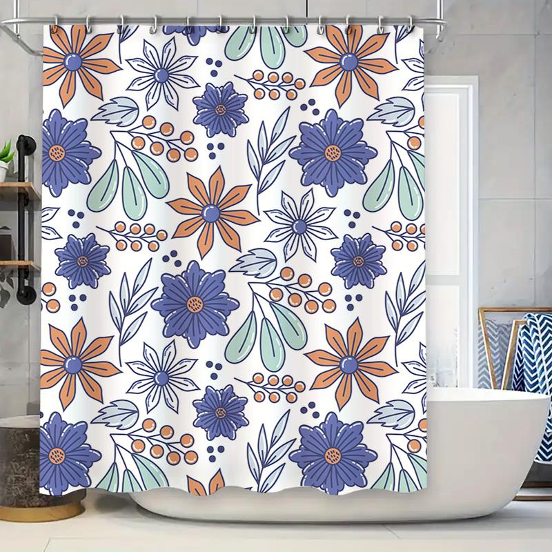 Artistic Blue Floral Shower Curtain with Green Accents for Bathroom Decor Polyester Fabric, Waterproof Bath Coverings, Size 180x