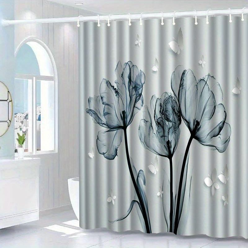 1pc Elegant Blue Flower Shower Curtain with Hooks - Artistic Floral Design for Bathroom Decoration, Suitable for Home and Hotel