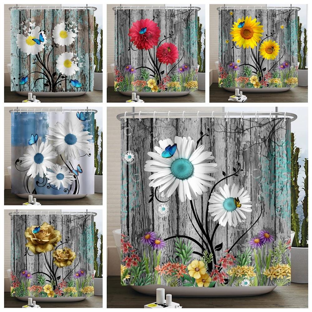 Rustic Sunflower Daisy Shower Curtain Butterfly Floral Vintage Country Farmhouse Flower Wooden Board Waterproof Bathroom Curtain