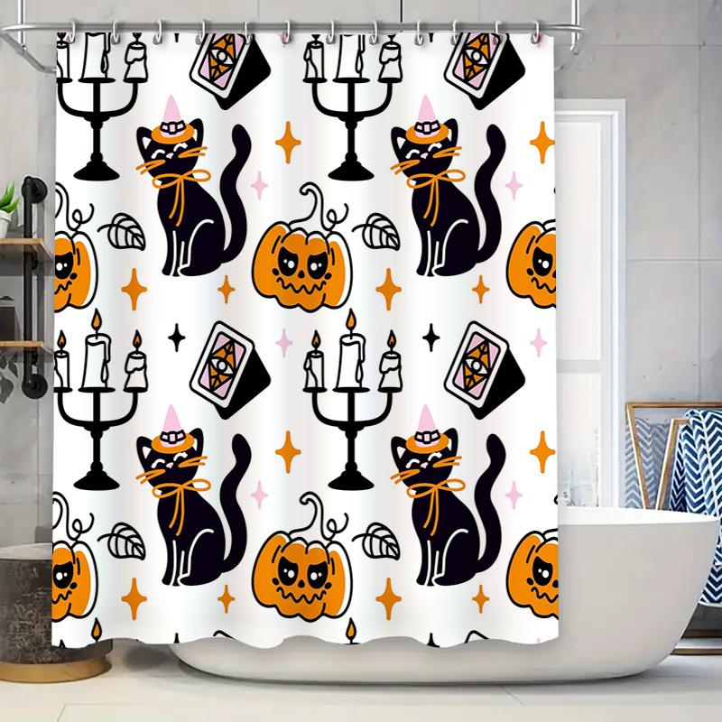 Halloween-themed shower curtain featuring cute black cats and pumpkins waterproof bathroom decor for kids' rooms or holiday part