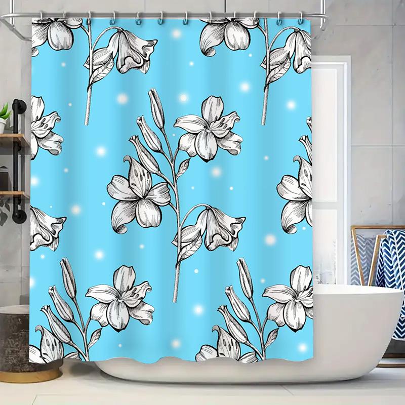 Luxury Blue Shower Curtain with White Flower Print Perfect for Bathroom Decor 3D Printed Shower Curtains Set Easy Installation W
