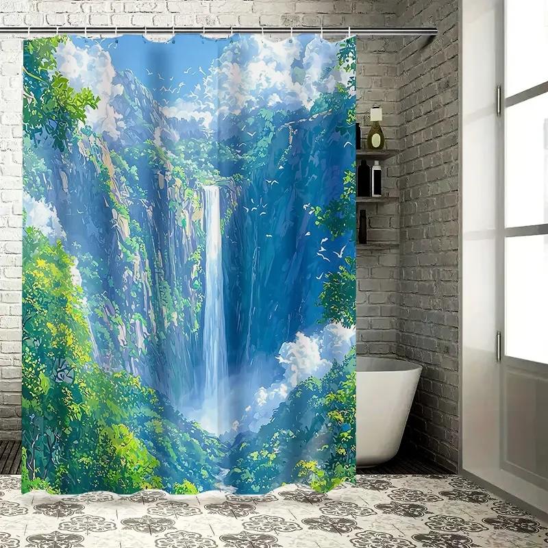 Vibrant Waterfall Shower Curtain for a Refreshing Bathroom, Featuring a Stunning Landscape with Lush Greenery and a Majestic