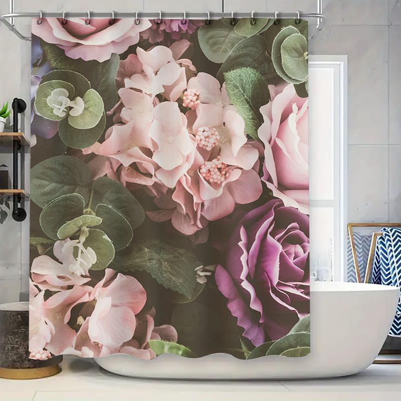 Zasłona prysznicowa z nadrukiem kwiatowym, Różowe Fioletowe Róże Hortensje Wystrój Ogrodu Wkładka do łazienki Wodoodporna Tkanina Poliestrowa Wystrój Domu