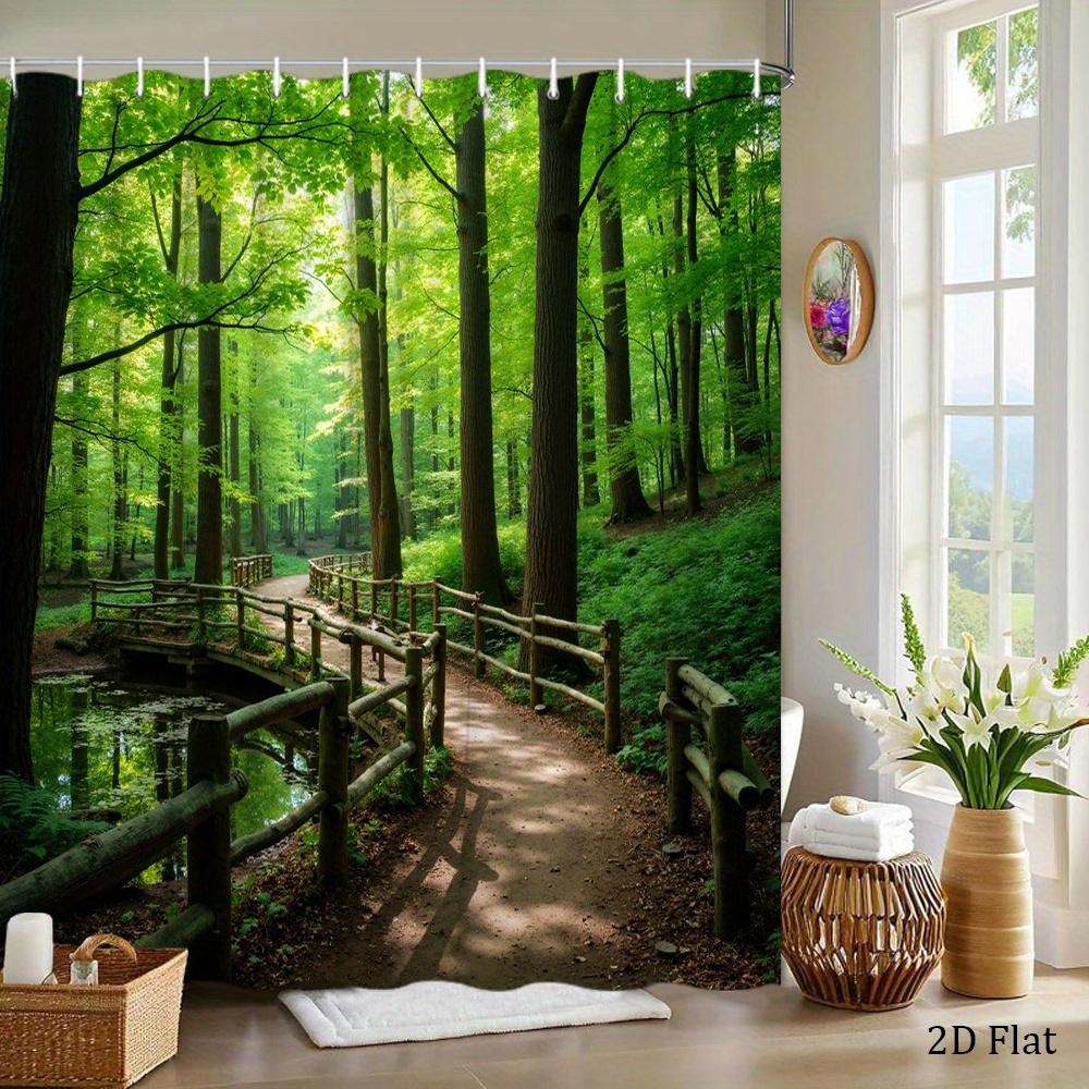 Forest Path Shower Curtain Green Trees and Wooden Bridge Print Polyester Bath Curtain with 12 Hooks for Nature Decor