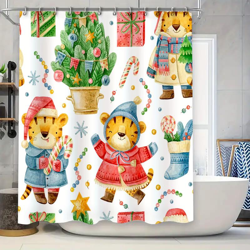 Christmas Collection Shower Curtain Tiger Family Party Decorations with Candy Cane Gifts Festive Home Decoration