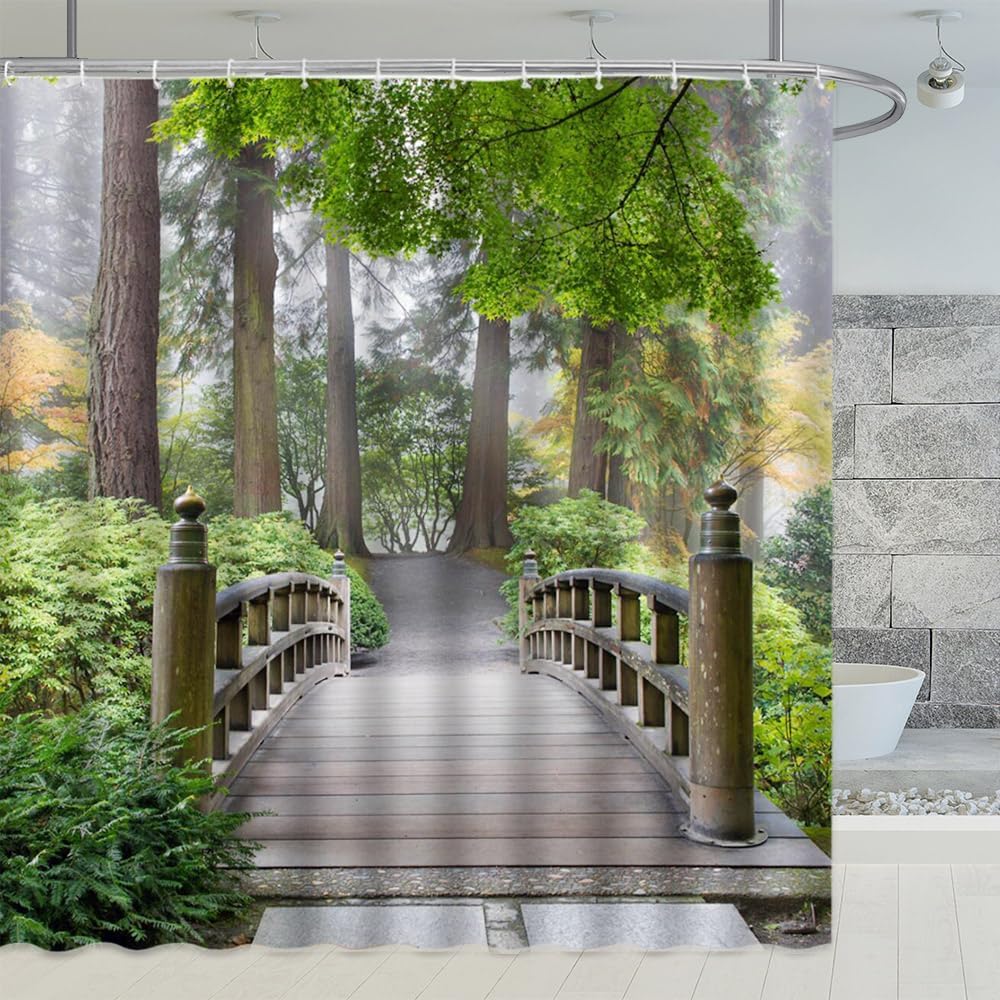 Landscapes Shower Curtains Wooden Bridge Forest Outdoor Natural Scenery Tree Leaves Plant Spring View Bathroom Decor Polyester