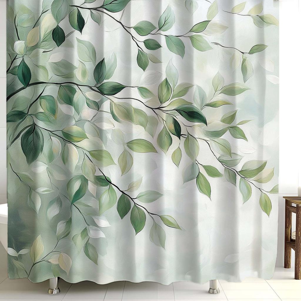 Open one piece retro simple green leaf print shower curtain with hook, machine washable, suitable for bathroom decoration