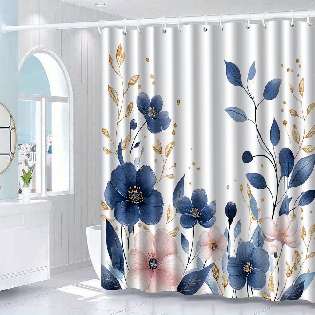 1pc blue floral pattern shower curtain with hooks, bathroom partitions, bathroom accessories, home decoration