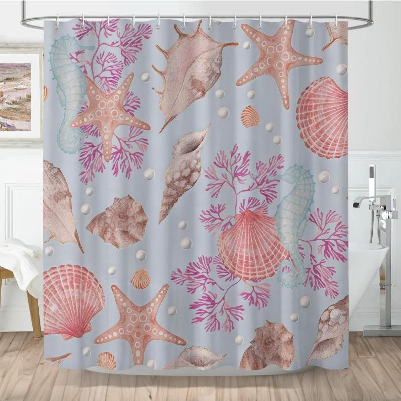 Nautical Coastal Shower Curtain, Beach Ocean Themed Shower Curtain Coastal Starfish Seahorse Seashells Coral Vintage Waterproof