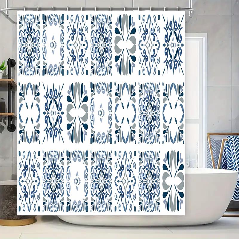 Blue White Decorative Shower Curtain Water-Resistant Fabric Modern Floral Patterns Easy Installation for Bathroom Decoration (59