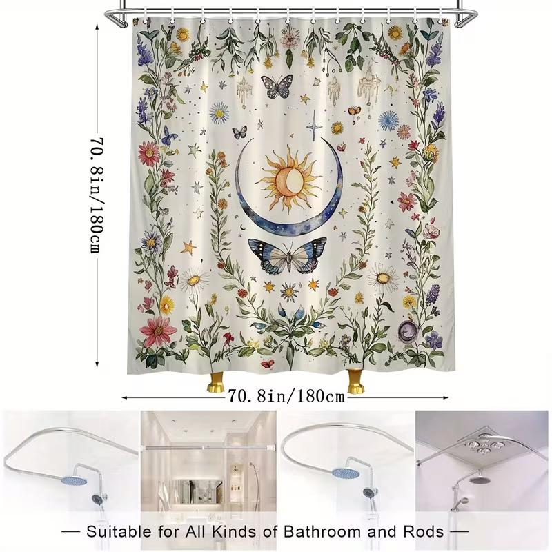 VIKAMA Celestial And Botanical Pattern Shower Curtain - Sun, Moon, Butterfly, And Floral Design, Vintage-Style Bathroom Decor