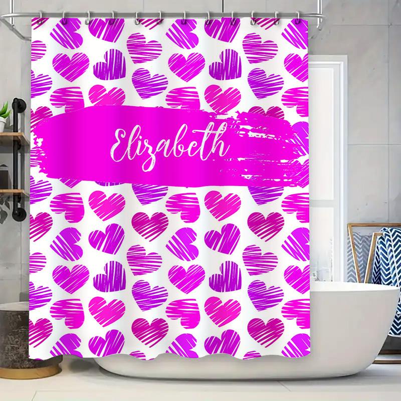 Pink Hearts Bathroom Shower Curtain Personalized with Name for Girls Gift Decor Home Decoration Waterproof Fabric Size Customize