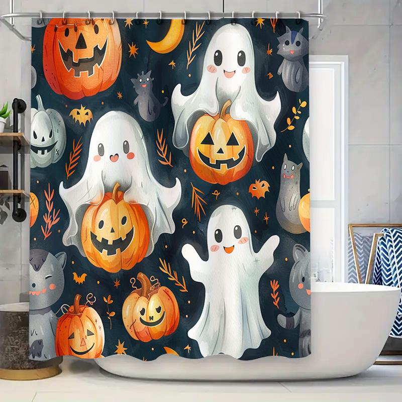 Spooky Halloween Ghosts Pumpkins Bath Shower Curtain Set Blue Floral Print Fabric Home Decor Waterproof Rainfall Curtain for Bat