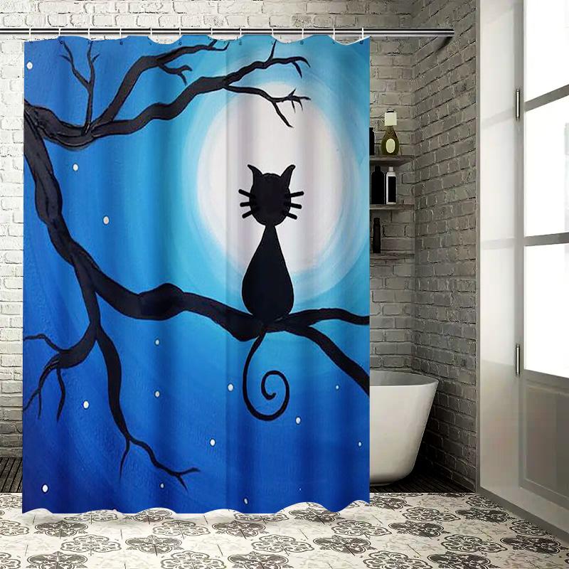 Black Cat on Branch Waterproof Shower Curtain Heat Resistant Machine Washable Non-Transparent 180x180cm