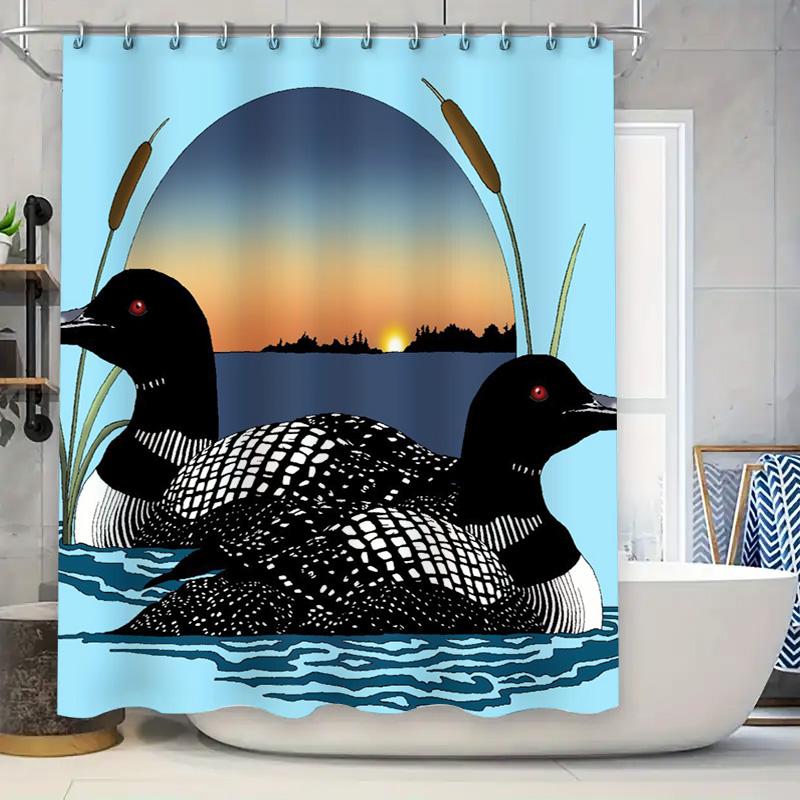 Blue Shower Curtain with Wildlife Print: A Peacock Pair Swimming in Water at Sunset Perfect for Your Bathroom Decor