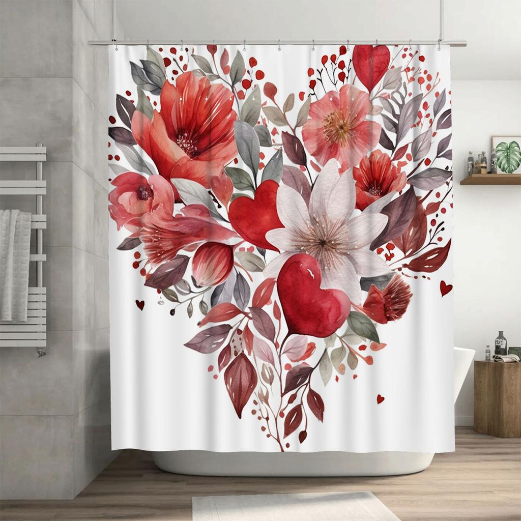 Romantic Red Floral Heart Shower Curtain - Waterproof, Mildew-Resistant, Machine Washable for Elegant Bathroom Decor