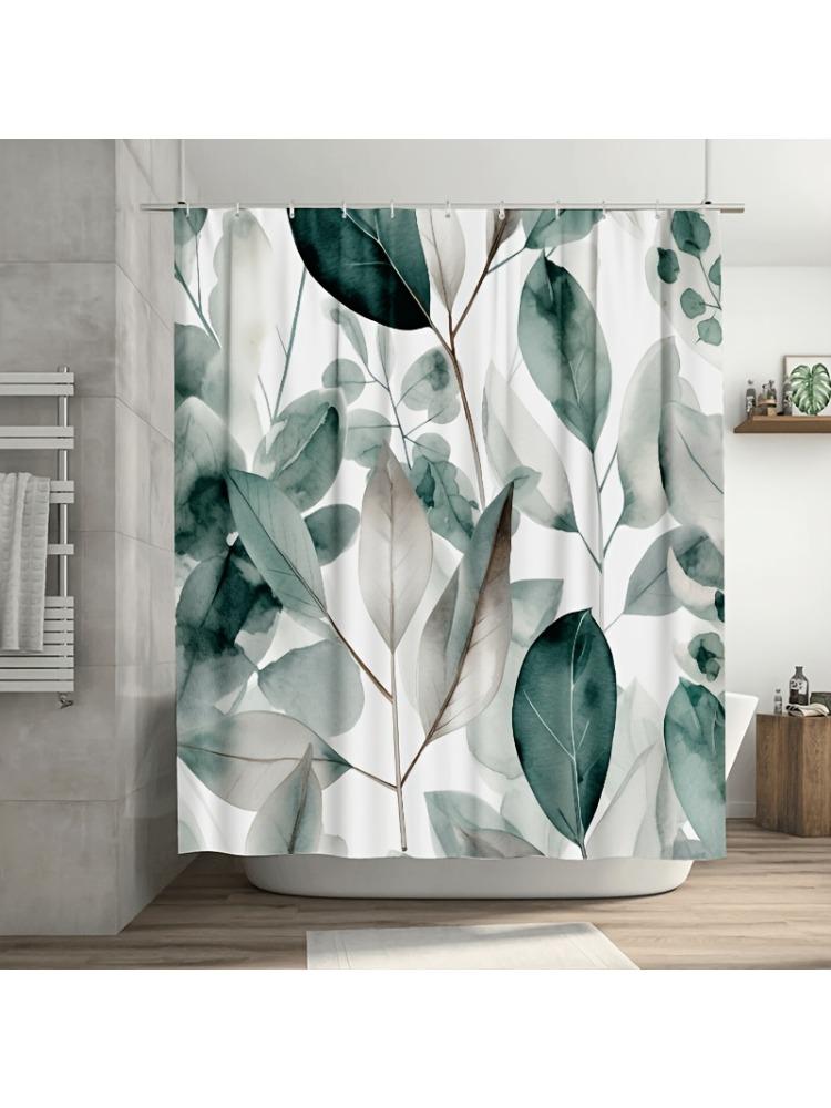 Watercolor Eucalyptus Leaves Shower Curtain - Soft Green & Teal, Easy Clean with Hooks