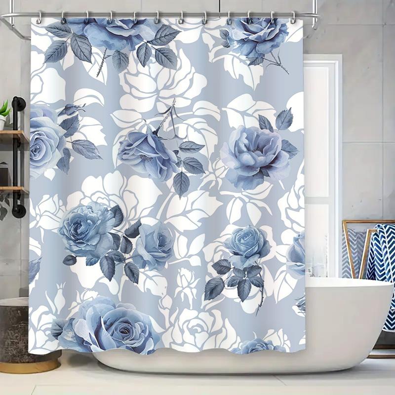 Elegant Floral Print Shower Curtain Blue Roses White Flowers Decorative Fabric Rectangular Size 180x245cm Perfect for Modern Bat