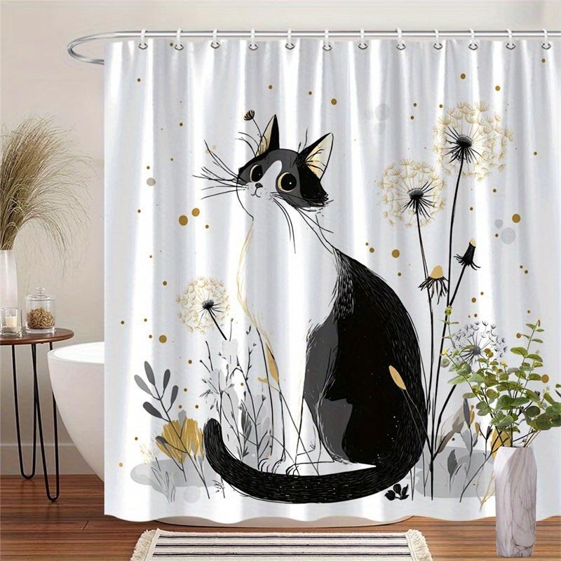1pc Black and White Cat and Dandelion Shower Curtain - Polyester Fabric, Machine Washable, Suitable for Bathroom Decoration