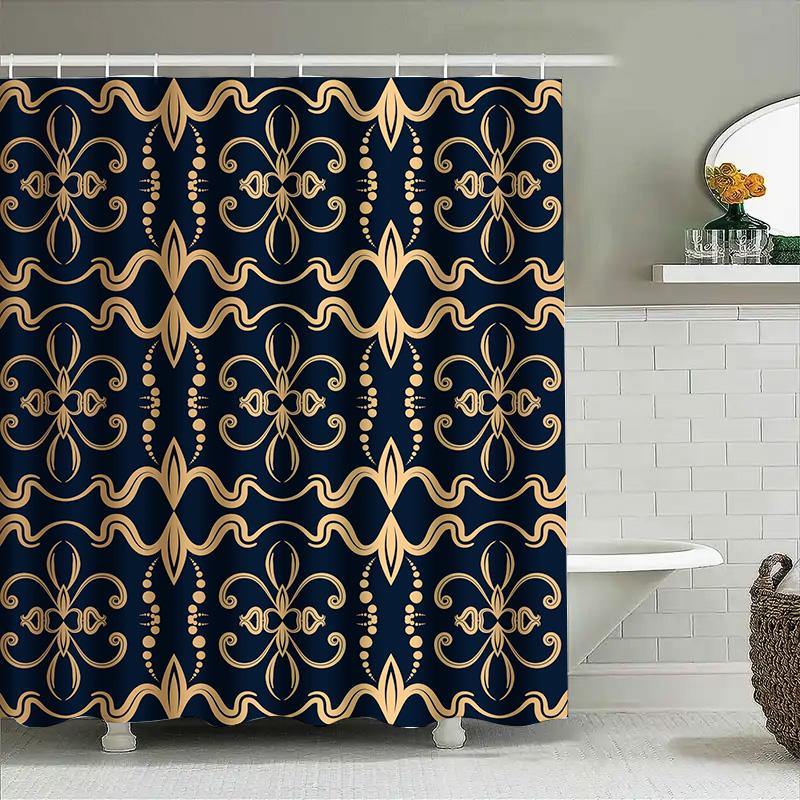Luxurious Shower Curtain Set Waterproof, Non-slip Bathtub Cover Elegant Blue Gold Pattern Decorative Shower Panels for Bathroom