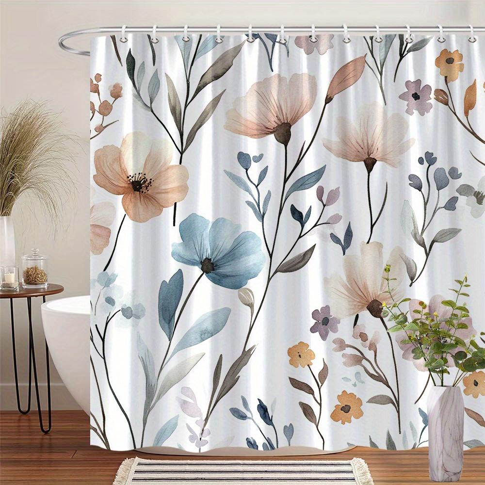 1 pastel floral shower curtain, blue and purple watercolor pattern with elongated leaves, with hooks, machine washable polyester