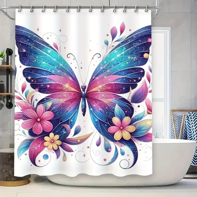 ~O~Colorful Butterfly Shower Curtain Decorative Bath Linen with 3D Flowers Waterproof Fabric for Bathroom Available in Custom Si